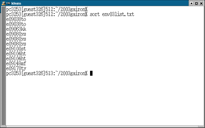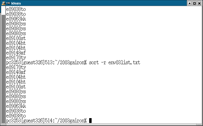 さて,このenv03list.txtの内容を行単位で,並べ替えます。この並べ替え作業を,整列(sort)と呼ぶ。