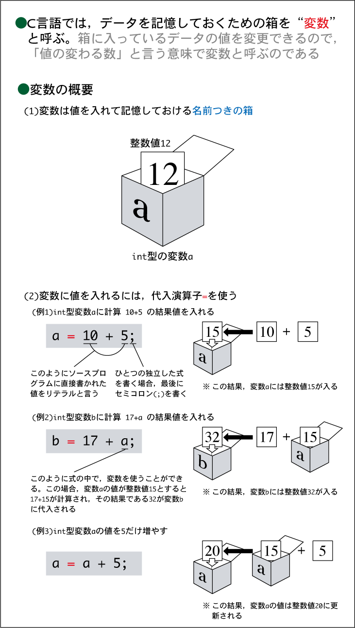 憶えさせておく「箱」を用意する。これを「変数」と言う。