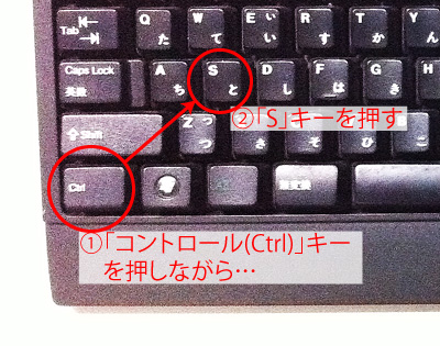 | 【ファイルの内容を保存する方法3】キーボードショートカットで保存する ①「コントロール(Ctrl)」キーを”押しながら”→ ②「S」キーを押す。 |