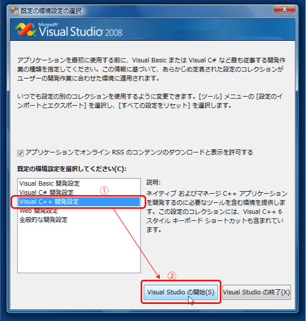 ①「Visual C++ 開発環境」を選んで, ②「Visual Studioの開始」ボタンを押す。この後,少し時間がかかる場合がある。
