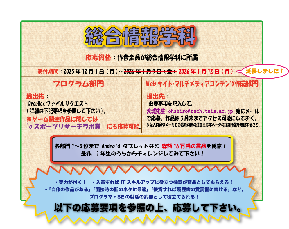![]() 総合情報学部総合情報学科 2025年度ソフトウェアコンテスト オフィシャルページ |